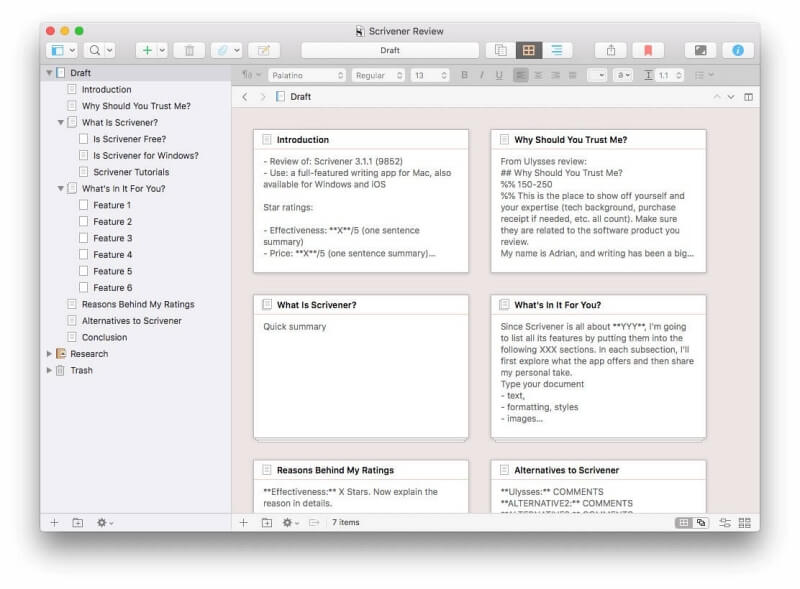 Scrivener와 Evernote는 모두 강력한 참조 및 연구 기능을 제공하지만 서로 다른 결과를 달성하도록 설계되었습니다. Scrivener’s는 줄거리 및 캐릭터 개발을 포함하여 책이나 소설에 필요한 배경 조사를 도와드립니다. 각 작문 프로젝트에 대해 별도의 연구 영역이 제공됩니다.